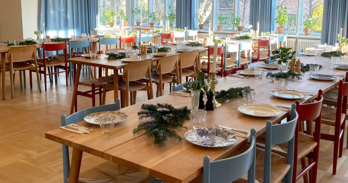 I husets store spisestue mødes gæster og lokale hver aften til fællesspisning ved langborde.